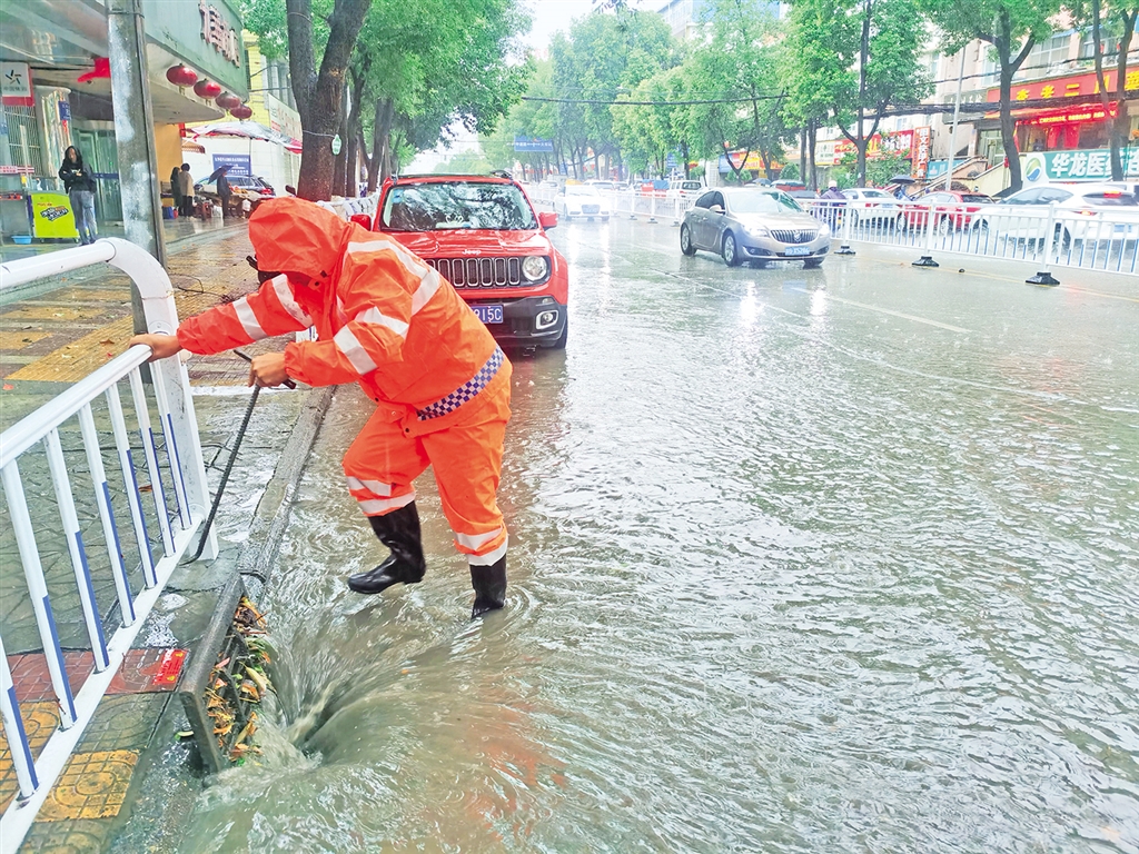 針對(duì)持續(xù)中到大雨的嚴(yán)峻形勢(shì),市市政園林處黨委充分發(fā)揮政治功能和組織優(yōu)勢(shì),堅(jiān)持人民至上、生命至上,城市道橋排水搶險(xiǎn)黨員突擊隊(duì)得令后,迅速進(jìn)入“戰(zhàn)時(shí)”狀態(tài),車輛、人員、裝備分組向著排澇最前沿火速集結(jié)。為在水中尋找更多井口,搶險(xiǎn)隊(duì)員徒手在臟水中摸尋并清除井蓋上的阻水雜物、撬開井蓋,加快積水排放,以最快的速度排除隱患,全力恢復(fù)城市正常道路交通秩序。一時(shí)間,隊(duì)員們衣服濕透,雨靴浸水,雨水和汗水交融,揮灑在茫茫雨海。