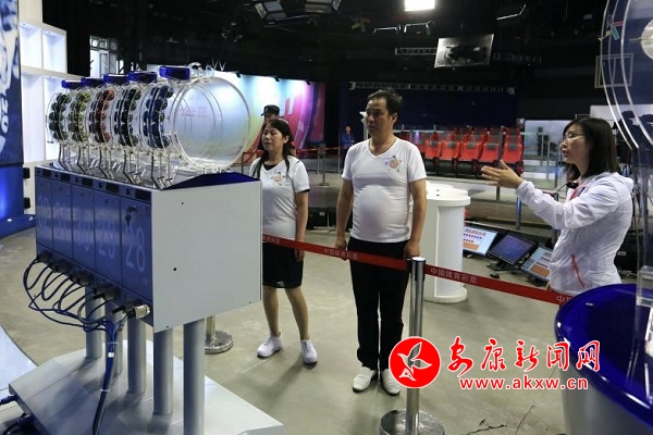19時(shí),安康觀摩團(tuán)在工作人員的指導(dǎo)下,進(jìn)行了嚴(yán)格有序的安檢工作。每個(gè)人都需要將隨身所帶物品全部放入存儲(chǔ)柜。所有人員安檢結(jié)束后,通過(guò)專(zhuān)用通道,憑實(shí)名認(rèn)證的通行證進(jìn)入開(kāi)獎(jiǎng)直播大廳。待大家整齊落座開(kāi)獎(jiǎng)直播大廳后,工作人員再次講解注意事項(xiàng),并邀請(qǐng)觀摩團(tuán)收看了開(kāi)獎(jiǎng)場(chǎng)地介紹、開(kāi)獎(jiǎng)流程、數(shù)據(jù)封存及搖獎(jiǎng)設(shè)備四個(gè)短視頻。工作人員還將試機(jī)球發(fā)給觀摩團(tuán)成員,讓大家真實(shí)感受搖獎(jiǎng)球的質(zhì)地,四名幸運(yùn)站長(zhǎng)被邀請(qǐng)到臺(tái)上零距離參觀搖獎(jiǎng)設(shè)備。