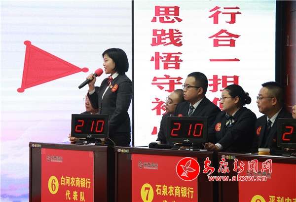 據(jù)了解,本次活動(dòng)以“學(xué)思踐悟守初心,知行合一擔(dān)使命”為主題,以習(xí)近平新時(shí)代中國(guó)特色社會(huì)主義思想、黨的十九屆四中全會(huì)精神、黨章黨規(guī)、掃黑除惡專項(xiàng)斗爭(zhēng)應(yīng)知應(yīng)會(huì)知識(shí)等為競(jìng)賽內(nèi)容,設(shè)置必答、搶答、風(fēng)險(xiǎn)、加試等環(huán)節(jié)進(jìn)行,來(lái)自安康各縣區(qū)農(nóng)商行10個(gè)代表隊(duì),共30名選手參與競(jìng)答。賽場(chǎng)上,氛圍緊張激烈,你追我趕,尤其在搶答題環(huán)節(jié),搶答令一經(jīng)發(fā)出,各隊(duì)選手立即開(kāi)始爭(zhēng)相搶拍競(jìng)答器,比分稍微落后的隊(duì)伍在搶到答題權(quán)后,出色作答后贏得現(xiàn)場(chǎng)陣陣掌聲,即使答錯(cuò),選手們也毫不氣餒,互相鼓勵(lì),立即調(diào)整狀態(tài)準(zhǔn)備下一次搶答。比賽現(xiàn)場(chǎng)精彩紛呈,觀眾不時(shí)為選手們精準(zhǔn)的回答報(bào)以熱烈的掌聲。
