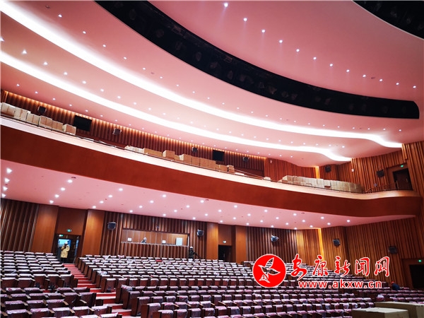 大廳右側(cè)為大劇場(chǎng),左側(cè)為小劇場(chǎng)。大劇場(chǎng)的舞臺(tái)長33.6米,高24.2米,舞臺(tái)正前方配有一個(gè)長14.3米、寬13.3米的升降舞臺(tái),劇場(chǎng)內(nèi)可同時(shí)容納1200人觀看演出。小劇場(chǎng)舞臺(tái)長18.3米,高11.3米。共有座位307個(gè),內(nèi)部設(shè)施安裝已基本完成。