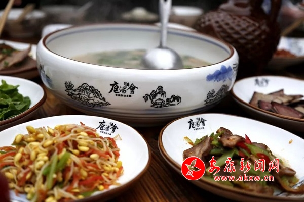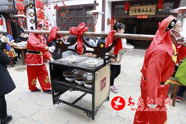 庖湯會的重點是吃“庖湯宴”。下午四點,庖湯宴正式開席。賓客8人一組圍桌而坐,28道石泉庖湯宴美食依次登場上桌,說菜人口吐蓮花,菜越說越香;酒歌高亢,越喝越暖;競?cè)ち,秦巴漢子劃出豪邁風(fēng)采;作坊小鎮(zhèn)聲動震天,年味香飄十里。