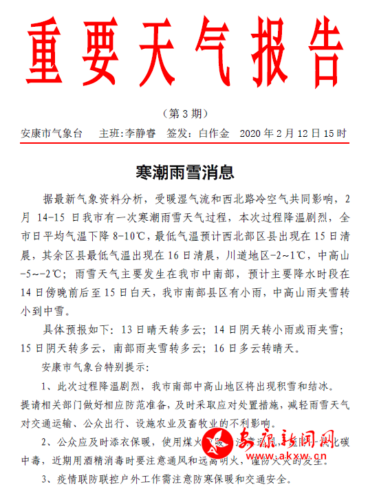 市氣象臺特別提示,此次過程降溫劇烈,我市南部中高山地區(qū)將出現(xiàn)積雪和結(jié)冰提請相關(guān)部門做好相應(yīng)防范準(zhǔn)備;公眾應(yīng)及時添衣保暖,使用煤火取暖時注意通風(fēng),謹防一氧化碳中毒,近期用酒精消毒時要注意通風(fēng)和遠離明火,謹防火災(zāi)的發(fā)生;疫情聯(lián)防聯(lián)控戶外工作需注意防寒保暖和交通安全。