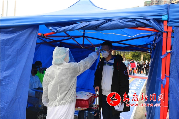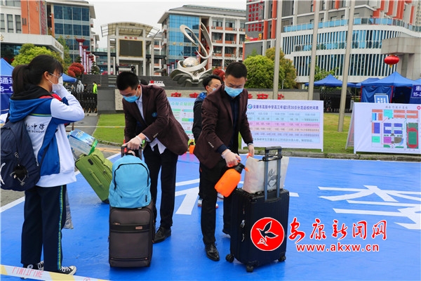 工作人員與老師在校門口有條不紊地開展著校園防疫工作,測體溫、查看“健康碼”、對(duì)行李及物品進(jìn)行消毒等工作有序進(jìn)行著。學(xué)校高三年級(jí)29個(gè)班、1300多名學(xué)生實(shí)行錯(cuò)峰報(bào)到,在今天早上9點(diǎn)至下午15點(diǎn),分批次從學(xué)校正門的四個(gè)通道進(jìn)入校園。QbV安康新聞網(wǎng)