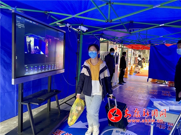在漢濱初中高新校區(qū)校門口,記者看到學(xué)生們戴著口罩保持著安全距離在排隊進入校內(nèi),旁邊還有很多幫孩子拿行李的家長在向他們交代相關(guān)注意事項。排在前列的學(xué)生有序?qū)⒆约旱慕】敌畔⒈斫唤o負責(zé)檢查的工作人員核對,通過之后會進入一個設(shè)有熱成像紅外線人體測溫儀的檢測點,每個從里面經(jīng)過的學(xué)生體溫都會出現(xiàn)在測溫儀的大顯示屏上,工作人員緊盯著屏幕排查異常人員。