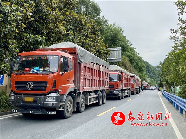 5月27日早上,記者在平利縣國道346k1643+300m處看到有20輛裝滿沙石料的貨車?吭谄嚼h徐家壩服務(wù)區(qū)附近。據(jù)了解,這20輛貨車是安康公路管理局關(guān)埡子治超卸貨場(chǎng)聯(lián)合平利縣交警大隊(duì)于26日晚9時(shí)陸續(xù)查獲的涉嫌超限超載的貨運(yùn)車輛。