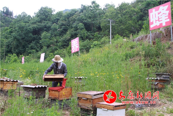 2017年,可以說(shuō)是余升富養(yǎng)蜂生涯的轉(zhuǎn)折點(diǎn)。漢濱區(qū)林業(yè)局、茨溝鎮(zhèn)林業(yè)站干部帶著茨溝鎮(zhèn)營(yíng)盤(pán)埡村村干部到嵐皋縣花里村余升富的養(yǎng)蜂基地考察養(yǎng)蜂項(xiàng)目,一次性購(gòu)買(mǎi)了500箱蜜蜂,運(yùn)回了茨溝。同時(shí),還把老余帶到了茨溝鎮(zhèn)參觀指導(dǎo)。