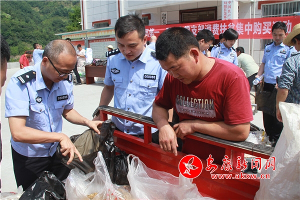 經(jīng)過前期充分對接,集中購買活動現(xiàn)場氣氛熱烈,幫扶群眾準(zhǔn)備的生豬、木耳、香菇、土豆、原釀酒等農(nóng)產(chǎn)品很快就被購買一空。銷售現(xiàn)場黨員民警、輔警們爭做愛心幫扶先鋒,積極購買扶貧產(chǎn)品,以實際行動助力消費扶貧,據(jù)統(tǒng)計,本次集中購買活動共購買農(nóng)戶豬肉210斤,原釀酒170斤,木耳、香菇50斤,土豆1200斤,其它各類干菜200余斤,總計價值13000余元。