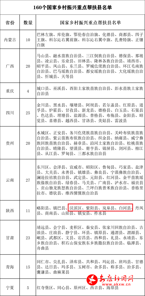 陜西省有11個(gè)縣被列入國家鄉(xiāng)村振興重點(diǎn)幫扶縣,其中,安康有4縣(區(qū)),分別為漢濱區(qū)、紫陽縣、嵐皋縣、白河縣。