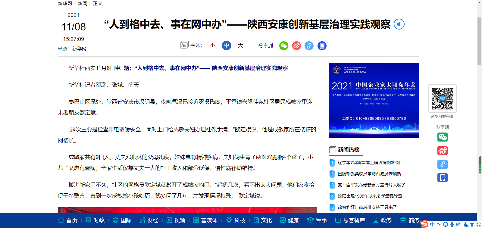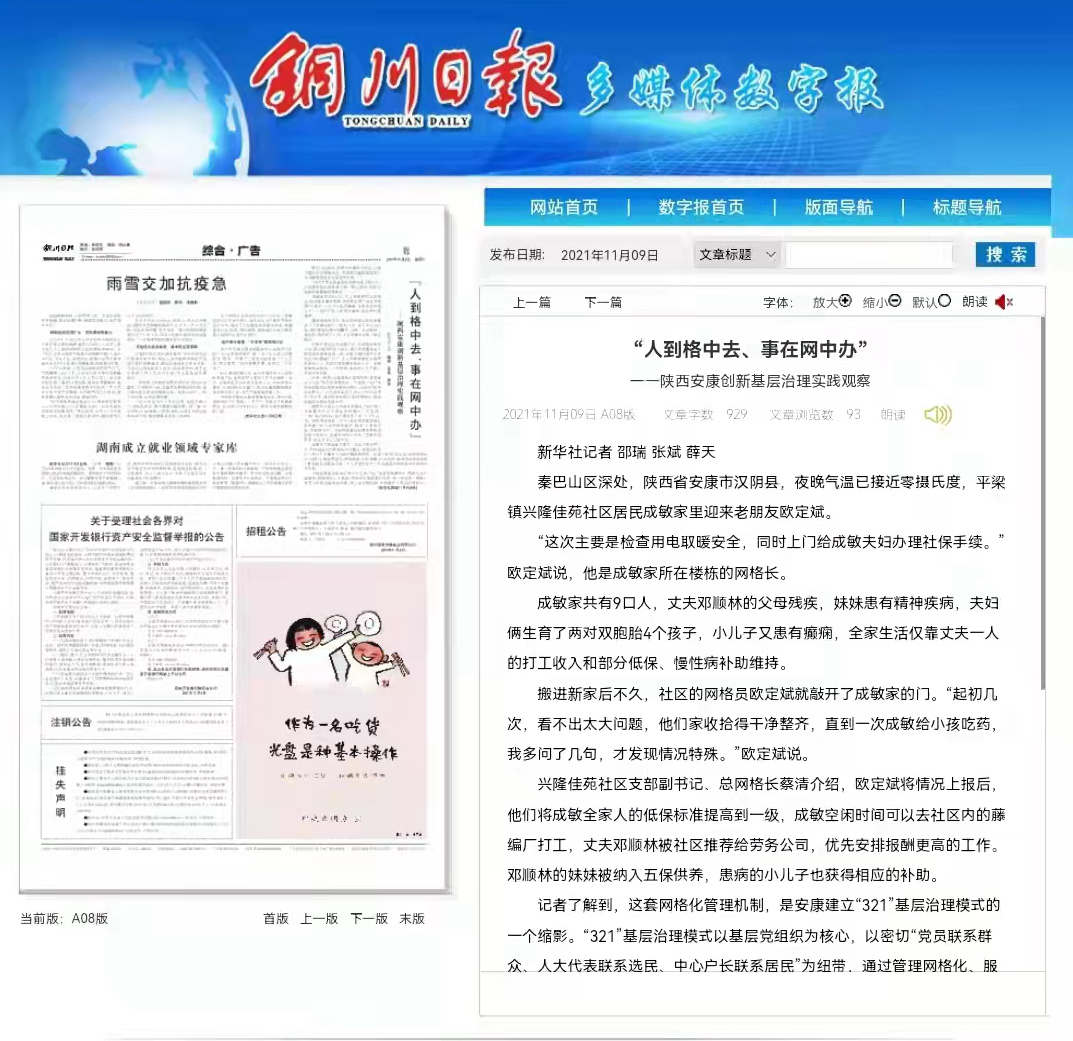 該模式是我市積極探索基層治理的生動(dòng)實(shí)踐,已在全市推廣。稿件發(fā)出后,新華網(wǎng)、光明網(wǎng)、半月談、中國(guó)小康網(wǎng)、21CN新聞、湖北日?qǐng)?bào)等80余家中省市媒體紛紛轉(zhuǎn)載,進(jìn)一步提升了我市“321”基層治理模式在全國(guó)范圍內(nèi)的影響力。一起來看看新華社記者眼中的安康基層治理實(shí)踐。