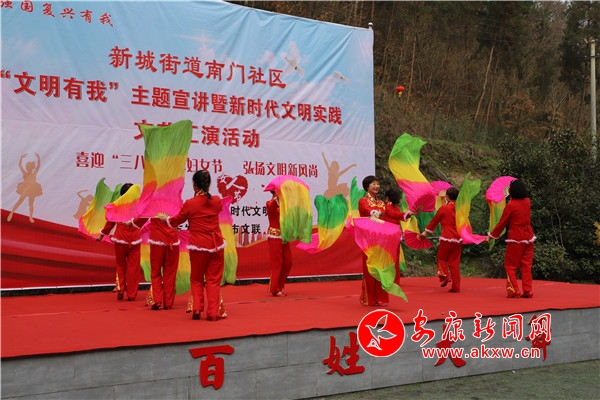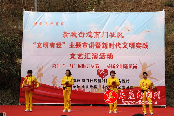 本網(wǎng)訊(記者 趙漪湉)為傳播文明理念,弘揚(yáng)時(shí)代新風(fēng),鞏固和提升創(chuàng)建全國文明城市工作成果,3月6日,市發(fā)改委、市文聯(lián)、漢濱區(qū)發(fā)改局、新城街道南門社區(qū)新時(shí)代文明實(shí)踐站聯(lián)合在南門社區(qū)成功舉辦“文明有我”主題宣講暨新時(shí)代文明實(shí)踐站文藝匯演。