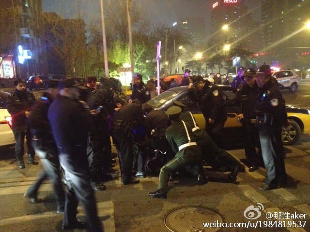 當時附近行人很多,該男子先是由西往東走了一小段,“這時候店內(nèi)沖出來了兩名身穿西服的男性工作人員,拿著金屬制品開始追趕該男子,”該男子見狀從兜里掏出了一把長約20公分的水果刀,一邊罵人,一邊越過馬路由東往西跑,兩名男店員在后面緊追不舍。圖為網(wǎng)傳抓捕現(xiàn)場。DGz安康新聞網(wǎng)
