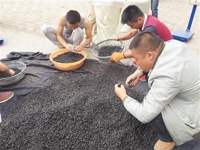 篩子里豌豆粒大小的黑枸杞,夾雜在土塊石子之間翻滾。他把黑枸杞濾出來,放在一邊,枸杞葉子放在另一邊,剩下的雜物,讓工人用手挑選,“一粒也別剩下。”