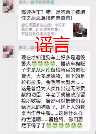 “求真”欄目記者發(fā)現(xiàn),有關(guān)“退役警犬被吃掉”的謠言時(shí)有發(fā)生。2016年11月19日,有志愿者在河北廊坊一高速收費(fèi)站攔截裝滿狗的大貨車,當(dāng)警方還在處理該案件時(shí),有人發(fā)帖稱“據(jù)該車狗販子講,這一車狗是從河南買的退役警犬。大多是德牧,剩下的是拉布拉多、金毛等大型犬。這些狗是曾經(jīng)為人類做出過無窮貢獻(xiàn)的功臣,年老了就被賣給萬惡的狗販子,送上人的餐桌當(dāng)作盤中餐”。2016年11月22日,北京首都國際機(jī)場(chǎng)警犬隊(duì)就退役警犬的情況進(jìn)行澄清:警犬退役后會(huì)在原基地養(yǎng)老或由訓(xùn)導(dǎo)員領(lǐng)養(yǎng),并稱“警犬很忙,要訓(xùn)練、要工作,退役后還要抓緊享受生活。保護(hù)動(dòng)物,請(qǐng)使用正確得當(dāng)?shù)姆绞剑灰?/span>警犬來綁架輿論”。[相關(guān)新聞]