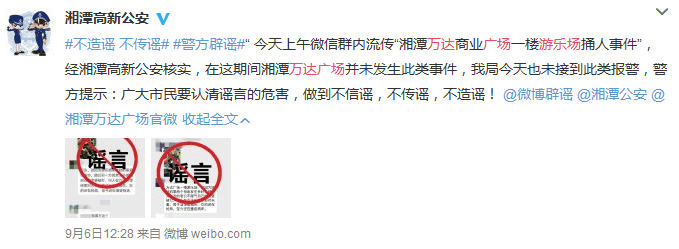 “求真”欄目記者發(fā)現(xiàn),不止湖北黃石,湖南湘潭、益陽以及山東煙臺都曾傳出“萬達(dá)廣場發(fā)生打架捅人事件”的消息,各地網(wǎng)警都進(jìn)行了辟謠。9月6日,湘潭高新公安通過官方微博表示,“經(jīng)核實,湘潭萬達(dá)廣場并未發(fā)生網(wǎng)傳的‘游樂場捅人事件’,警方也未接到此類報警”。