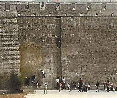 北京青年報(bào)記者在網(wǎng)友提供的照片中看到,正定古城墻外壁的墻磚間形成了一級(jí)級(jí)兩三厘米寬的小臺(tái)階,十幾個(gè)孩童側(cè)著身子、徒手攀爬至兩三米高處,家長(zhǎng)們站在城墻下給孩子拍照,而一旁“禁止攀爬”的警示牌則被無視。更有成年攀爬者在沒有保護(hù)措施的情況下,徒手攀爬至六七米高。眾多游客攀爬城墻,遠(yuǎn)看好似攻城,甚至讓部分游客誤以為這是該旅游景點(diǎn)的游樂項(xiàng)目。