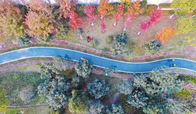 圖為11月27日空中俯瞰新建的“慢行綠道”。為給市民出行營(yíng)造良好的環(huán)境,國(guó)家園林城市——浙江省慈溪市今年9月底在北三環(huán)路兩側(cè)開(kāi)辟出兩條3公里長(zhǎng)的“慢行綠道”。該綠道采用生態(tài)透水混凝土,并配以座椅、垃圾桶、照明等設(shè)施,綠蔭環(huán)繞滿布花草。近兩年來(lái),浙江省慈溪市積極倡導(dǎo)市民綠色低碳出行,目前該市共建成“慢行綠道”22公里。