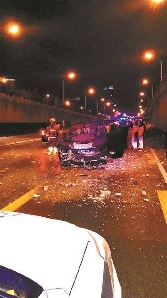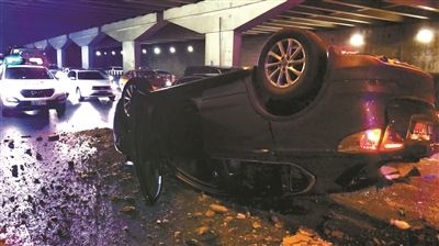 目擊者拍攝的現(xiàn)場照片顯示,這輛黑色小轎車“四腳朝天”摔在農(nóng)展橋下的三環(huán)主路上,車頭及駕駛艙部位受損嚴重,地面上滿是玻璃碎片。農(nóng)展橋橋面一側的護欄也被破壞,被汽車撞下橋面。