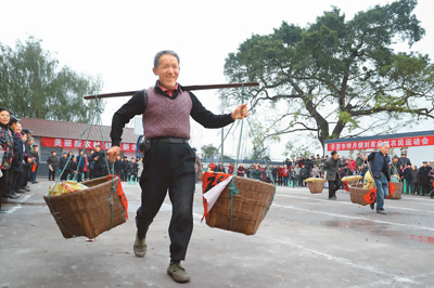近日,四川省華鎣市明月鎮(zhèn)劉家廟村舉行以“美麗新農村,健康新農民”為主題的農民運動會。通過精準扶貧逐漸走上致富之路、過上幸福生活的村民參加了挑擔子、包抄手、套圈等趣味競技項目,以這種特別的方式慶祝豐收。圖為劉家廟村村民在參加挑擔子比賽。8Wf安康新聞網
