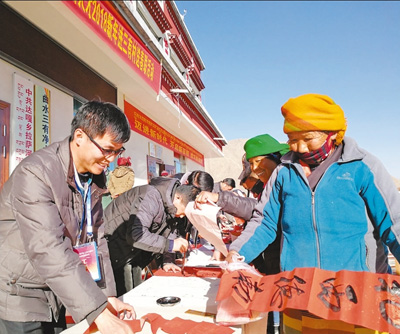 1月7日,第八批援藏干部中的20多名書法愛(ài)好者和西藏自治區(qū)書法家協(xié)會(huì)部分會(huì)員來(lái)到位于拉薩河畔的曲水縣三有村,為當(dāng)?shù)?84戶藏漢群眾現(xiàn)場(chǎng)寫福字,送春聯(lián)。