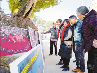 1月11日,浙江嵊州市長樂鎮(zhèn)水竹村村民在觀看攝影師的作品。f5t安康新聞網(wǎng)