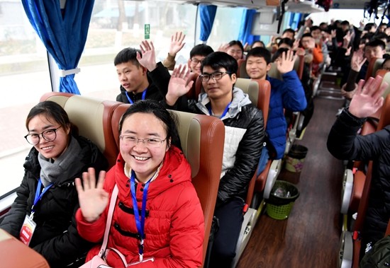 當(dāng)日,2018接阜陽(yáng)籍大學(xué)生回家活動(dòng)在安徽農(nóng)業(yè)大學(xué)啟動(dòng),來(lái)自安徽農(nóng)業(yè)大學(xué)、安徽醫(yī)科大學(xué)、合肥工業(yè)大學(xué)等高校的200余名阜陽(yáng)籍大學(xué)生免費(fèi)乘坐大巴車返回家鄉(xiāng)過(guò)年。新華社記者 劉軍喜 攝