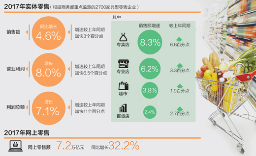 商務部近日發(fā)布的數據顯示,去年我國實體零售發(fā)展態(tài)勢良好,重點監(jiān)測的2700家典型企業(yè)銷售額同比增長4.6%,增速較上年同期加快3個百分點。去年我國網上零售額突破7.2萬億元,同比增長32.2%。