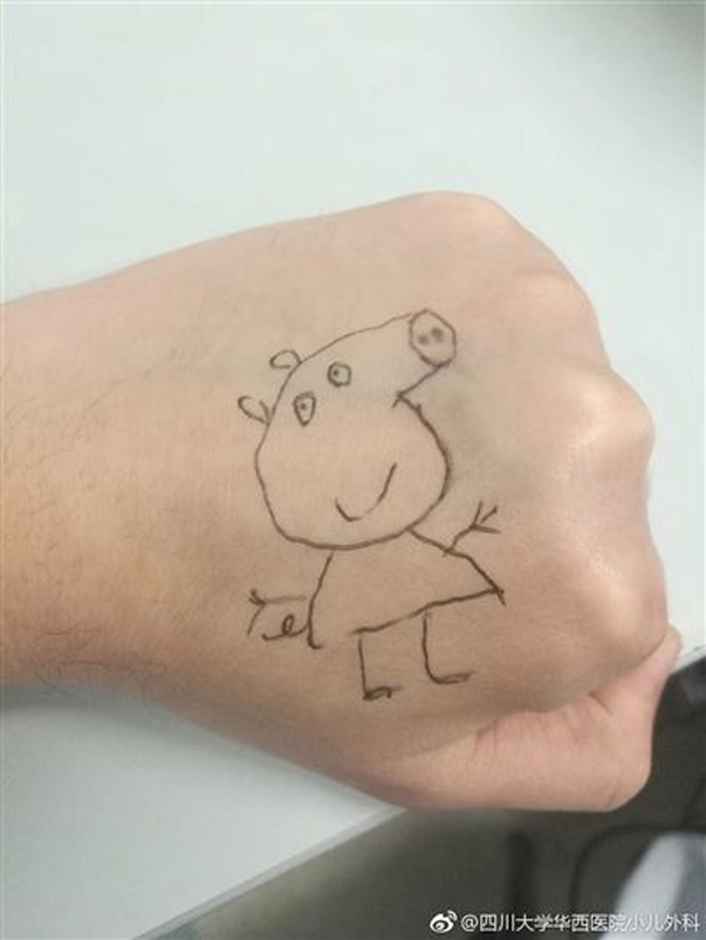 “小豬佩奇身上紋,值班用來哄病人!4月7日,四川大學(xué)華西醫(yī)院小兒外科主治醫(yī)師楊磊為了讓患者小朋友們心情愉悅,主動在左手上畫了一只流行卡通人物小豬佩奇來“討歡心”。因?yàn)樽袷責(zé)o菌原則,小豬佩奇很快就被洗掉,但這一幕還是被網(wǎng)友點(diǎn)贊,認(rèn)為“有愛且專業(yè),感控愛心都需要!