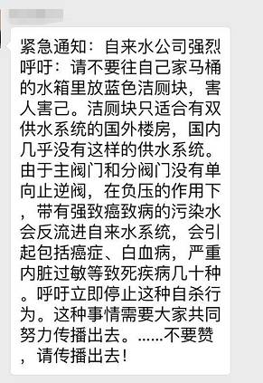 網(wǎng)上熱傳的消息稱,“自來水公司強(qiáng)烈呼吁,請廣大市民不要往自家馬桶的水箱里,放藍(lán)色潔廁塊,害人害己,潔廁塊只適合國外有雙供水系統(tǒng)的樓房,國內(nèi)幾乎沒有這樣的供水系統(tǒng),由于主閥門和分閥門,沒有單向止逆閥,在負(fù)壓的作用下,帶有強(qiáng)致癌致病的污染水,會(huì)反流進(jìn)自來水系統(tǒng),會(huì)引起包括癌癥,白血病,嚴(yán)重內(nèi)臟過敏等至死疾病幾十種......”