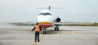 | 圖為5月2日,ARJ21—700新支線噴氣客機(jī)駛進(jìn)哈爾濱太平國(guó)際機(jī)場(chǎng)停機(jī)坪。(記者 丁汀 攝) |