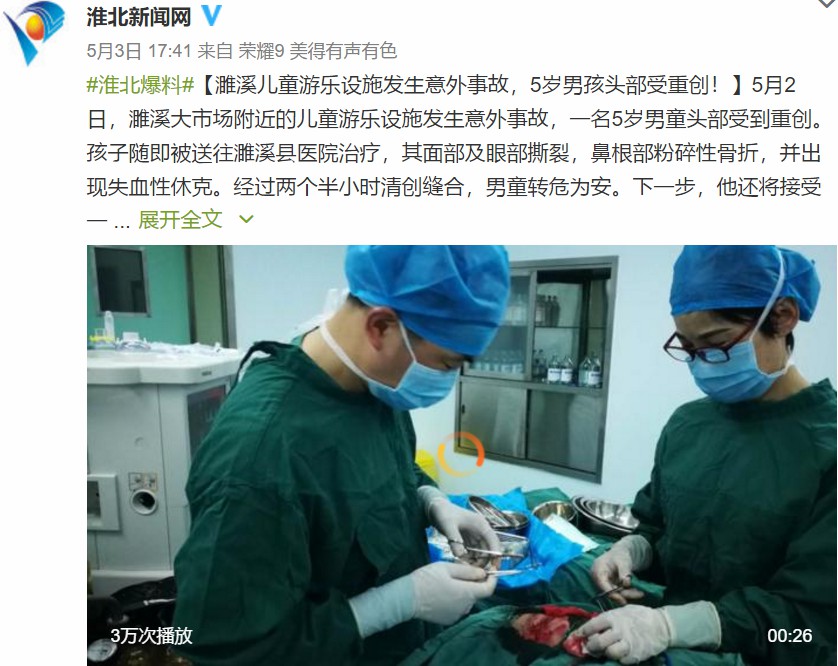 對此,石家莊、孝感等地網(wǎng)警紛紛辟謠。據(jù)“淮北新聞網(wǎng)”報道,2018年5月2日,安徽省濉溪縣大市場附近的兒童游樂設(shè)施發(fā)生意外事故,一名5歲男童頭部受到重創(chuàng)。孩子隨即被送往濉溪縣醫(yī)院治療,其面部及眼部撕裂,鼻根部粉碎性骨折,并出現(xiàn)失血性休克。經(jīng)過兩個半小時清創(chuàng)縫合,男童轉(zhuǎn)危為安,后續(xù)還要繼續(xù)進行治療。