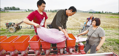 5月29日,在河南省南陽市唐河縣黑龍鎮(zhèn)大朱莊村,農(nóng)民在給播種機(jī)添加種子。目前,唐河縣農(nóng)民利用有利的天氣條件,搶抓農(nóng)時,播種花生、玉米等農(nóng)作物。(記者 馮大鵬 攝) Fd8安康新聞網(wǎng)