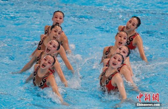 圖片說明:在8月29日下午結(jié)束的雅加達亞運會花樣游泳集體自由自選比賽中,中國隊憑借《鳳舞國粹》的出色發(fā)揮,奪得金牌。中新社記者 杜洋攝