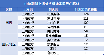 中秋期間上海虹橋、浦東機場出港熱門航線。