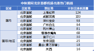 中秋期間北京首都機場出港熱門航線。