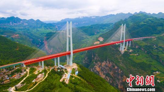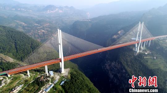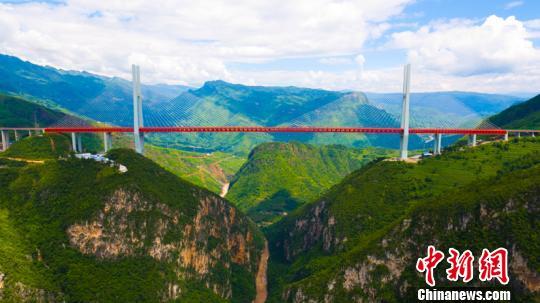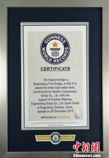 中新網貴陽9月19日電(周燕玲)記者19日從貴州省交通運輸廳獲悉,杭瑞高速畢都北盤江大橋,經世界紀錄認證機構——吉尼斯世界紀錄有限公司認證,北盤江大橋橋面距江面垂直高度達565.4米,榮獲“世界最高橋”之稱,載入世界紀錄大全史冊。