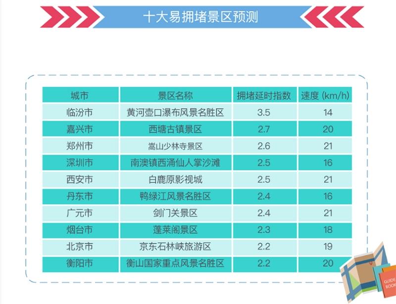 報告顯示,十一期間周邊道路易擁堵景區(qū)排名前十中,黃河壺口瀑布風景區(qū)周邊道路擁堵延時指數達3.5,平均車速僅為每小時14公里,成為國慶出行周邊道路最為擁堵的景區(qū)。西塘古鎮(zhèn)擁堵延時指數為2.7,排名第二,平均車速為每小時20公里;排在第三名的是嵩山少林寺景區(qū)以擁堵延時指數2.6,平均車速每小時21公里。