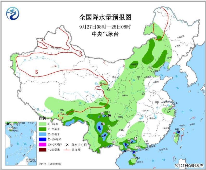 9月27日08時至28日08時,內(nèi)蒙古中東部、東北地區(qū)西南部、華北西部和北部、西北地區(qū)東部、江漢西部、西南地區(qū)大部、華南中西部、江南西南部和東北部、西藏中東部和臺灣島等地有小到中雨,其中,四川西南部、云南東北部、廣西中南部、廣東西南部和臺灣島北部等地的部分地區(qū)有大雨,局地有暴雨或大暴雨(100~120毫米)。新疆東部、內(nèi)蒙古中西部、西北地區(qū)東部等地的部分地區(qū)有4~6級偏北風(fēng)(見圖1)。
