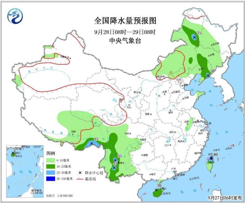 9月28日08時至29日08時,內(nèi)蒙古中東部、東北地區(qū)中西部和南部、華北北部、西南地區(qū)北部和南部、華南南部、西藏中東部和臺灣島等地部分地區(qū)有小到中雨,其中,內(nèi)蒙古東部、遼寧東南部、云南中部、西藏東南部和臺灣島北部等地部分地區(qū)有大雨,臺灣島北部局地暴雨(50~80毫米)。新疆北部、內(nèi)蒙古西部、華北北部、江南東北部等地的部分地區(qū)有4~6級偏北風(fēng)(見圖2)。