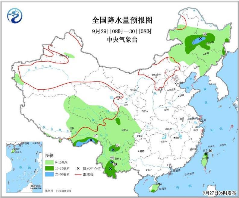 9月29日08時至30日08時,內(nèi)蒙古東部、東北地區(qū)大部、西南地區(qū)大部、海南島、青藏高原中東部和臺灣島等地部分地區(qū)有小到中雨,其中,黑龍江西南部和西藏東南部等地的部分地區(qū)局地大雨(25~40毫米)。新疆北部、內(nèi)蒙古中部、華北北部、江南東部等地的部分地區(qū)有4~6級偏北風(fēng)(見圖3)。