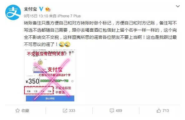 9月15日,“@支付寶”官方微博對(duì)此辟謠稱:轉(zhuǎn)賬備注只是方便自己和對(duì)方轉(zhuǎn)賬時(shí)做個(gè)標(biāo)記,方便自己和對(duì)方記賬,備注寫(xiě)不寫(xiě)選不選都隨自己需要,跟你去喝喜酒紅包信封上留個(gè)名字一樣一樣的,這個(gè)完全不影響交不交稅。