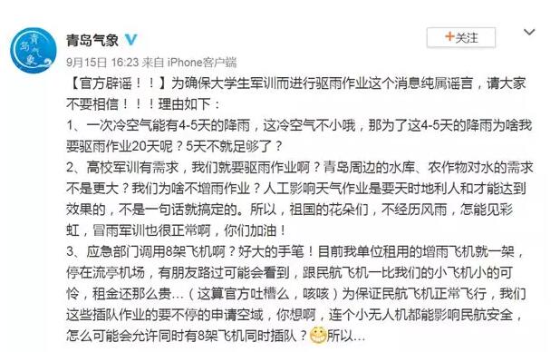 9月15日,青島市專業(yè)氣象臺(tái)“@青島氣象”發(fā)布微博辟謠,稱“為確保大學(xué)生軍訓(xùn)而進(jìn)行驅(qū)雨作業(yè)”這個(gè)消息純屬謠言,請(qǐng)網(wǎng)友們不要相信。