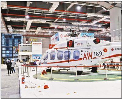 進(jìn)博會8個展館搭建工作正在進(jìn)行,一架直升機在展臺上就位。 新華社記者 方 喆攝