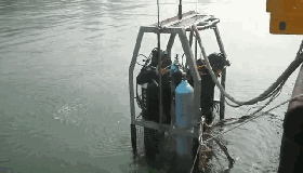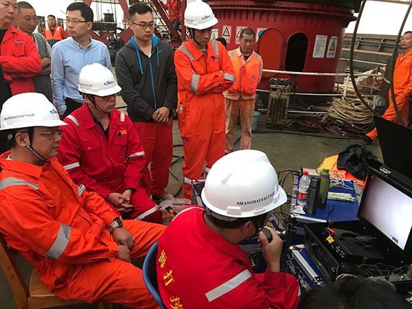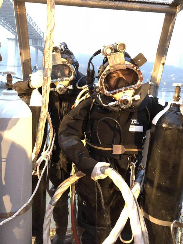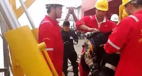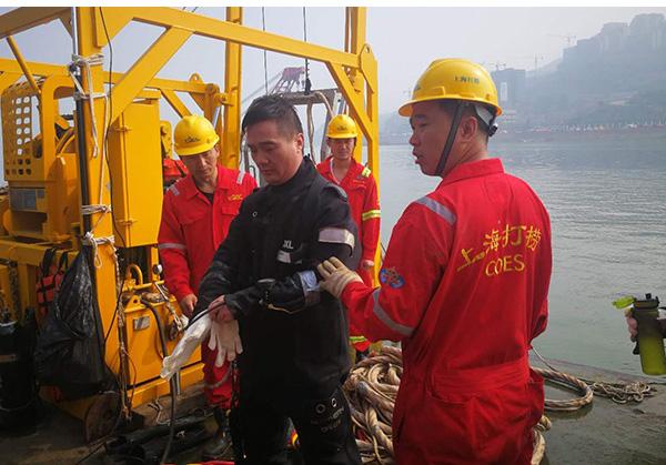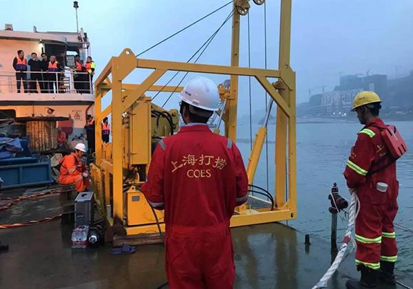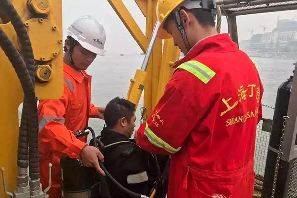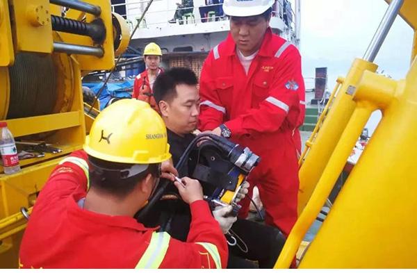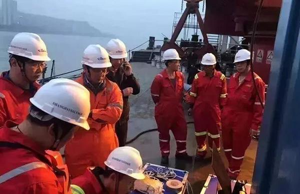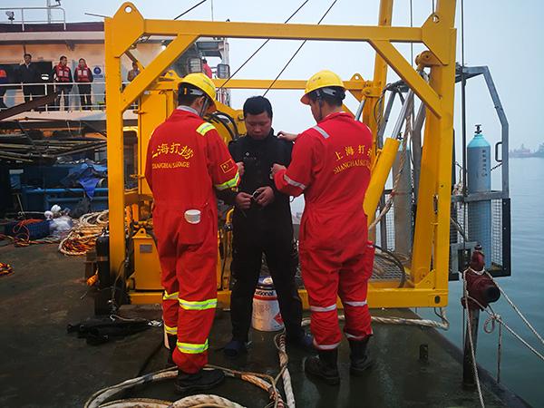 6時(shí)50分,設(shè)備調(diào)試完成后,交通運(yùn)輸部上海打撈局兩名專業(yè)潛水員第一次下水摸探。