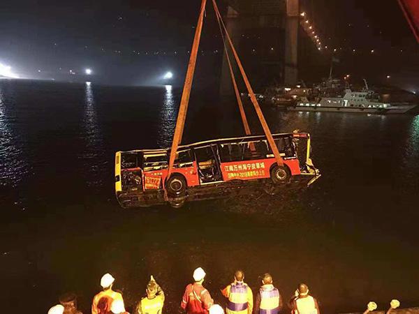 21時(shí)31分,開始對重慶萬州墜江公交車進(jìn)行起吊工作。23時(shí)45分,成功將墜江公交車整體打撈出水。