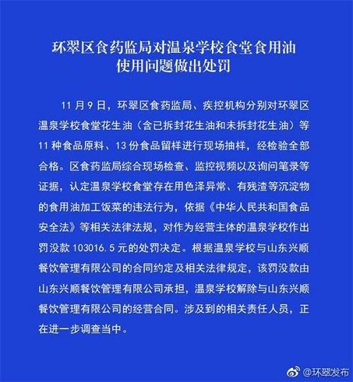 人民網(wǎng)濟(jì)南11月13日電(翟晨曦)13日,山東省威海市環(huán)翠區(qū)人民政府新聞辦公室官方微博@環(huán)翠發(fā)布發(fā)布微博,環(huán)翠區(qū)食藥監(jiān)局對(duì)溫泉學(xué)校食堂食用油使用問題做出處罰。