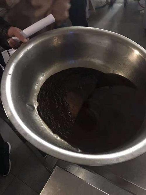 面盆內(nèi)疑盛放黑色食用油,盆底有沉淀物。 學(xué)生家長(zhǎng)供圖