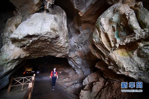 一名參觀者走出位于福建省三明市三元區(qū)巖前鎮(zhèn)的萬壽巖國家考古遺址公園船帆洞(11月24日攝)。新華社記者 姜克紅 攝