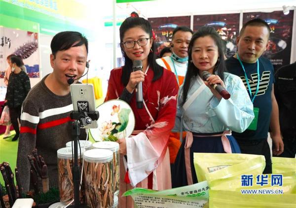11月6日,參展商在森林食品展區(qū)直播銷(xiāo)售鹿角靈芝。