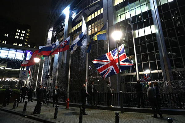 2020年1月31日,在比利時布魯塞爾的歐洲議會外,工作人員降下英國國旗。布魯塞爾當(dāng)?shù)貢r間1月31日24時(英國時間1月31日23時),英國正式脫離歐盟。新華社記者 鄭煥松 攝