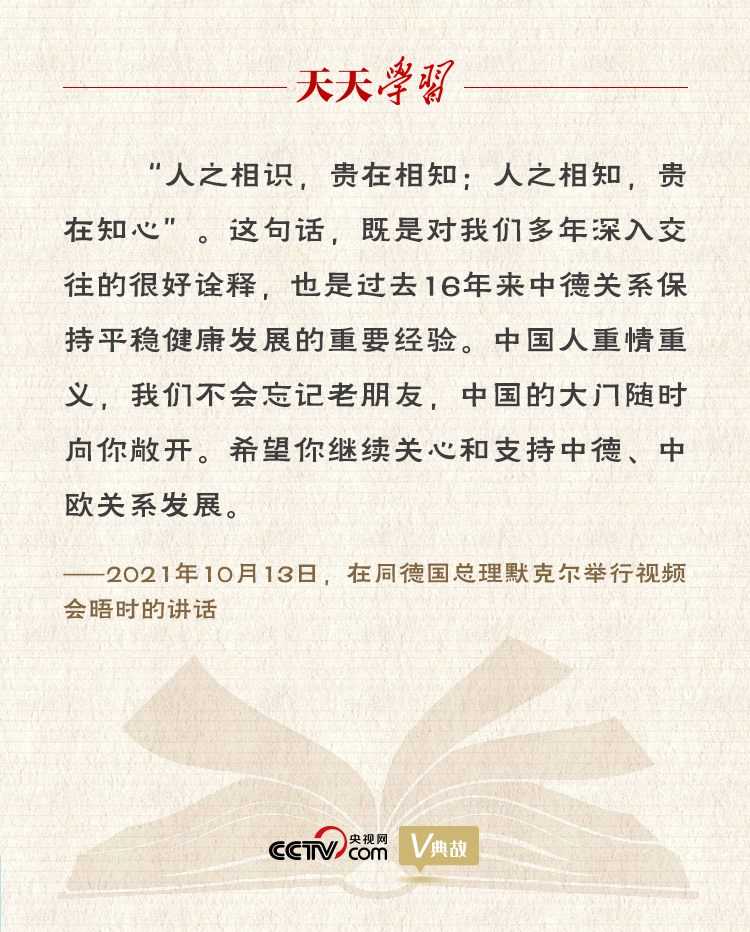 10月13日,習近平主席同德國總理默克爾舉行視頻會晤。雙方在友好的氛圍中回顧近年中德、中歐關系發(fā)展并就相關問題深入交換意見。習主席積極評價默克爾任內(nèi)為推動中德、中歐關系發(fā)展所作的貢獻,并引用“人之相識,貴在相知;人之相知,貴在知心”,稱這句話“既是對我們多年深入交往的很好詮釋,也是過去16年來中德關系保持平穩(wěn)健康發(fā)展的重要經(jīng)驗”。
